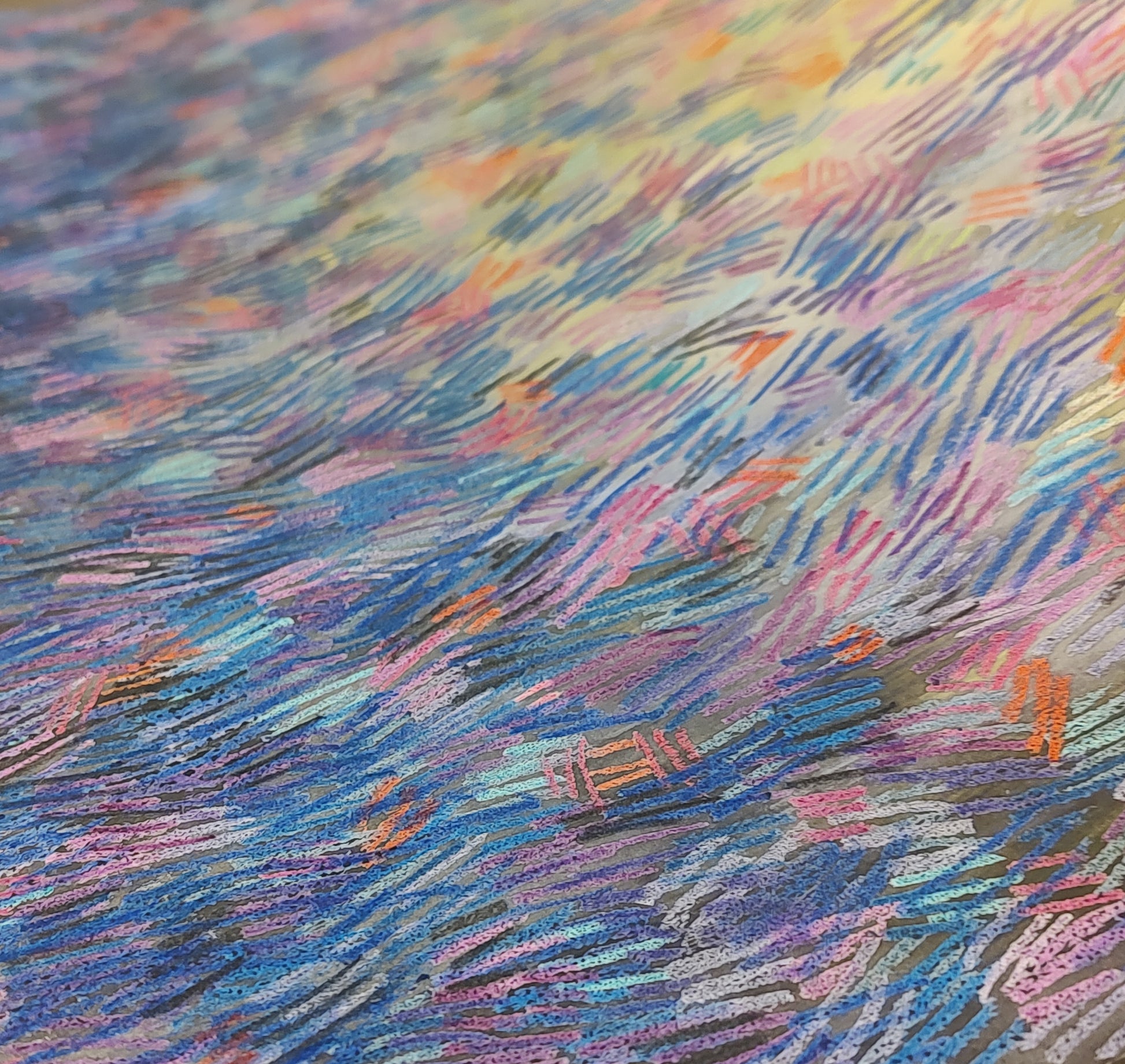 This 13"x19" mixed media illustration is intense. Utilizing layers of watercolor pushed into the grain of wax crayon, "And Then" invites the viewer to lay down in a field of color. Are the short, firm crayon marks stars, flowers, or fairies? You can decide for yourself as you take in the tightly packed landscape in dozens of different rainbow hues sparkling with light.