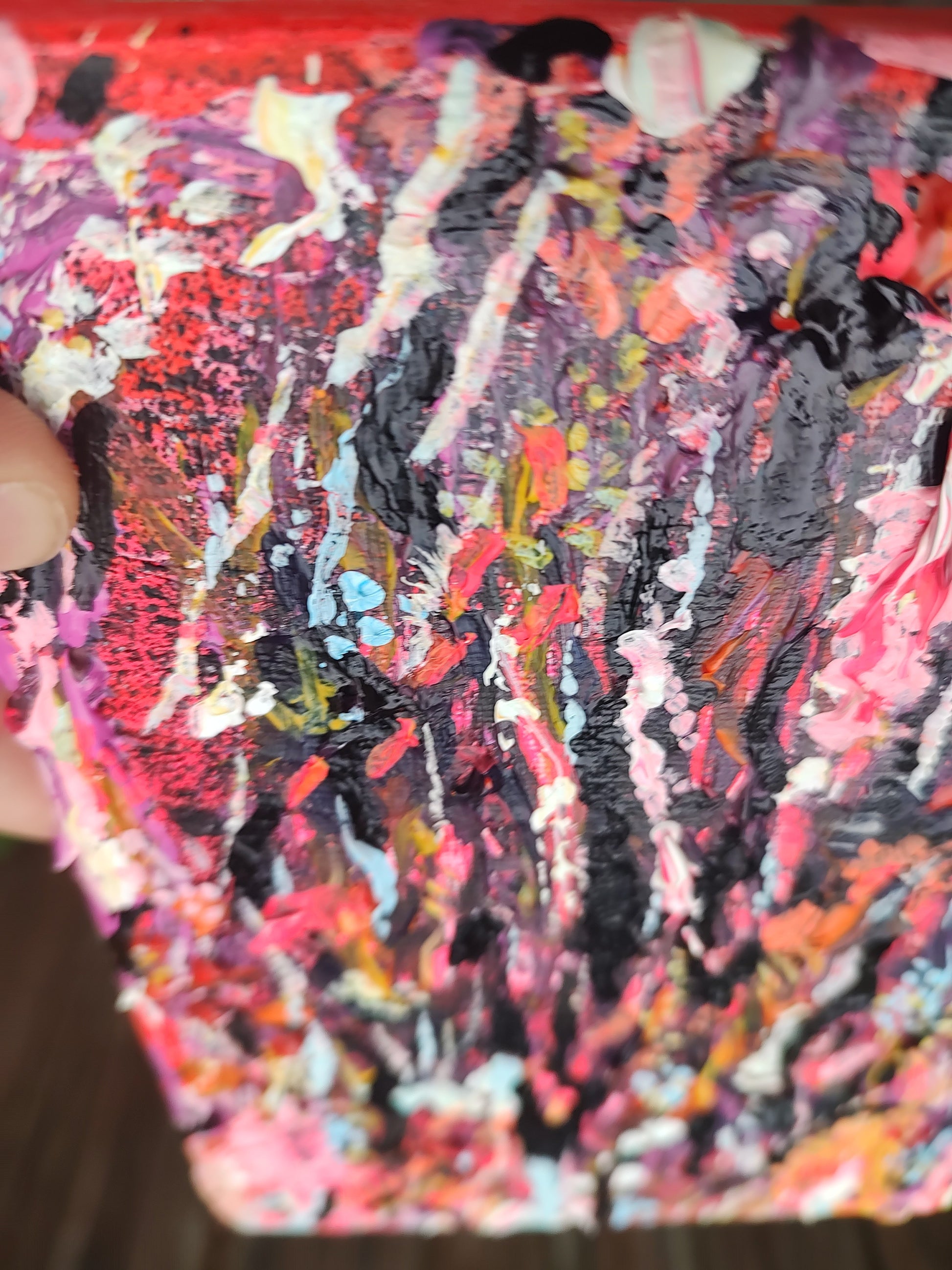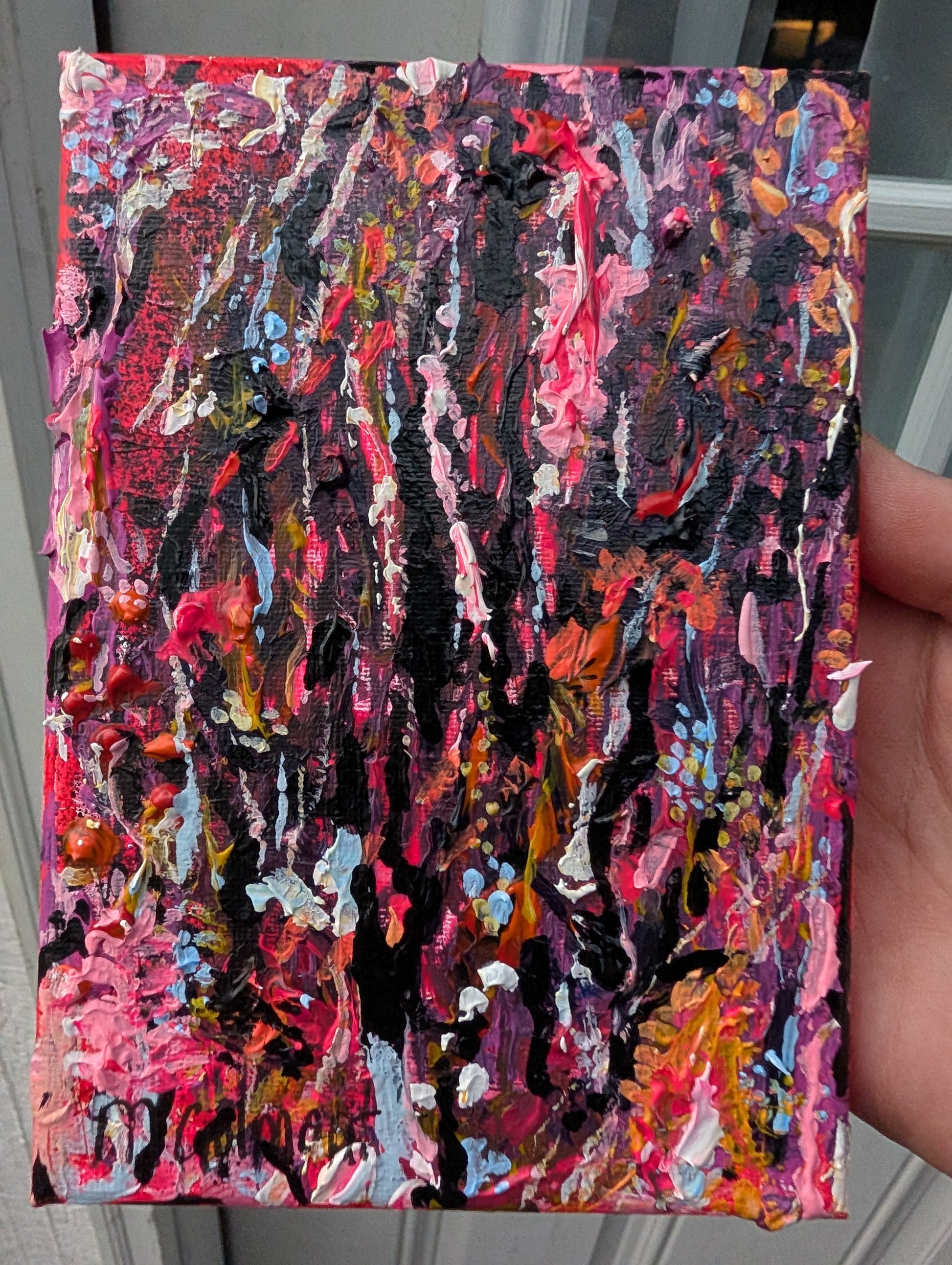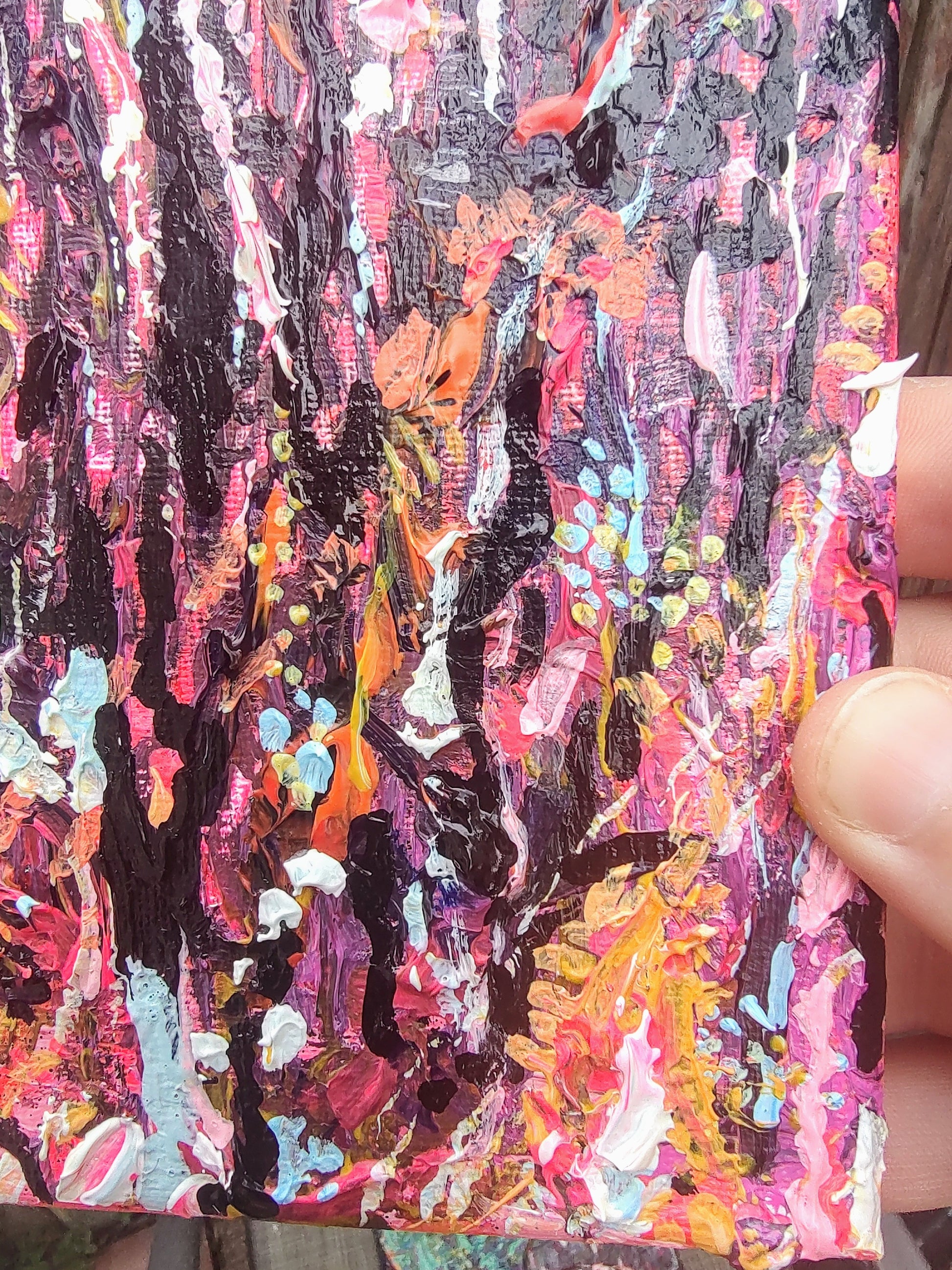 Spring is here! Inspired by the exuberance of early April meadows, this painting has all the vibrancy and complexity of a riotously blooming thicket of flowers. Many layers of neon, fluorescent, pastel, and heavy body paints build a rich textured landscape, while intense color contrast invites you to spend some time letting your eyes wander the field.