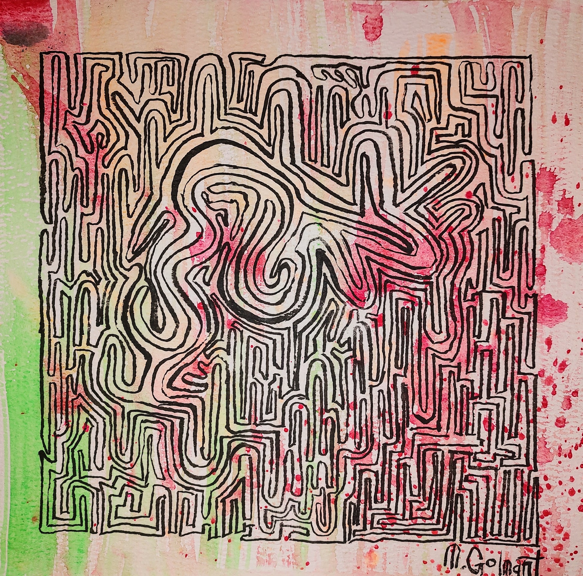 This 8"x8" watercolor and brush pen illustration draws the ey through abstract lines and neon splashes of color in a way that might make a viewer dIzzy. Incredibly, the entire illustration is comprised of one continuous line from beginning to end, running around and around until the space is filled to the brim. Though it hints at navigability, every path in this maze like picture meets a wall.