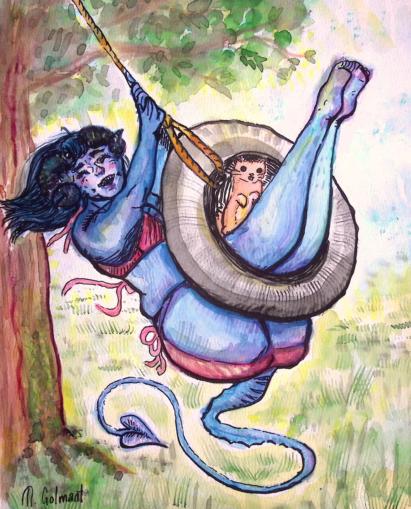 This original watercolor and brush pen illustration on paper measures 9"x12" and ships flat. It is vibrantly colorful in person and sealed for long lasting color integrity. Celebrate the liveliness of springtime with Jester's joyful playfulness!